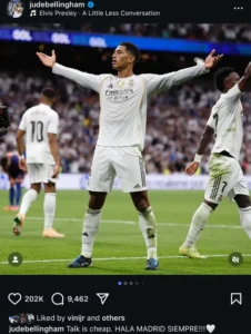 „Да се говори е лесно. Хайде, Реал! Завинаги!“, написа Белингам в профила си в Instagram. Той публикува и няколко снимки от мача, включително кадър с емоционалното си празненство след гола за 2:1.