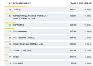 Втори са ПП-ДБ с 14.20%, а „Възраждане“ вземат 13.35%. ДПС-Ново начало получава 11.54% от гласовете, а БСП -7.56%. Алианса за права и свободи на Ахмед Доган са пети със 7.48%. Седми са „Има такъв народ“ със 6.77% от гласовете. МЕЧ са с 4.59%.