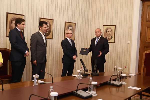 Николай Денков и Кирил Петков, Божидар Божанов и Людмила Илиева дойдоха на „Дондуков“ 2, за да вземат и върнат мандата, връчен им от президента Румен Радев. Те закъсняха с 5 минути за процедурата.