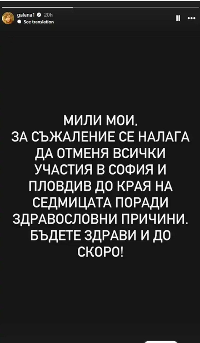 Певицата Галена не е разкрила никакви детайли за състоянието си, което моментално притесни феновете ѝ. Много от тях започнаха да се чудят какво ѝ е и защо отсъства от публичното пространство.