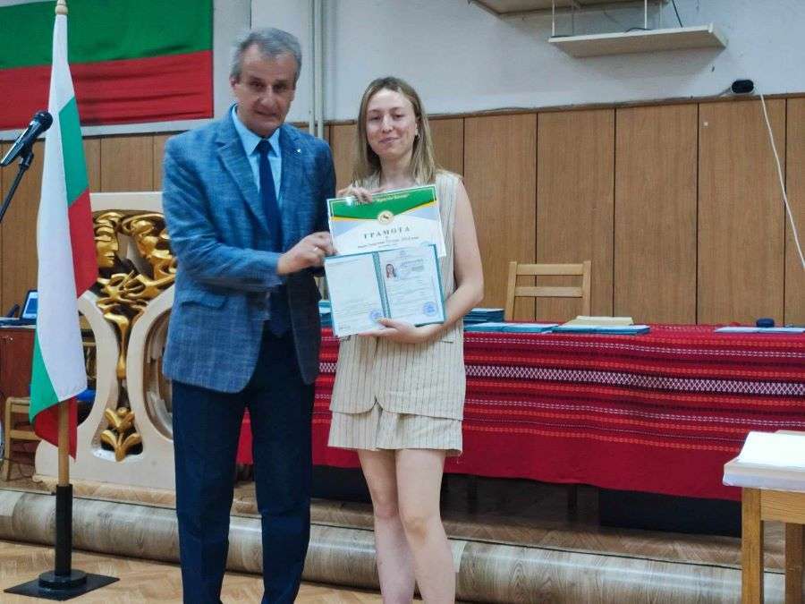 Директорът инж. Костадин Костадинов, доволен от по-добрите резултати на випуск 2024 в сравнение с предходните, реши да добави към дипломите и плик със сума, съобразена с успеха. Такава награда получиха 14 ученици от специалностите „Интериорен дизайн“, „Полиграфия“ и „Мебелно производство“, завършили с успех от 5.50 до 5.90. Първи бяха отличени Ивана Петкова и Кристина Вълчева, които завършиха с еднакъв успех – 5.90. Кристина планира да учи „Интериорен дизайн“ в Лесотехническия университет, като на кандидатстудентския изпит по изобразително изкуство изкара 5.50, а оценките й от ДЗИ по български език и от държавния изпит за професионална квалификация са съответно 5.10 и 6.00. Ивана избра „Икономика и бизнес“ в Пловдивския университет и ще се класира с оценките от ДЗИ – 5.13 и 6.00.