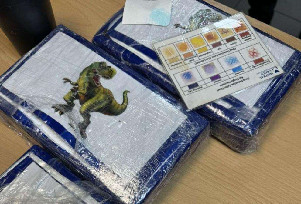 В хладилника, намиращ се в шофьорската кабина под хранителни продукти, са укрити три пакета с картинки на динозаври, опаковани с фолио.