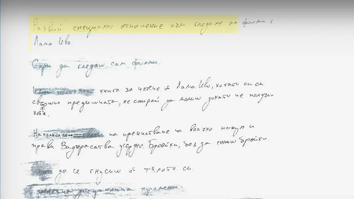 Има и записки, свързани с тибетския будизъм. Сред тях са формулировки като: „Развий специално отношение към гледане на филми с Лама Иво“, „Бройки, без да гониш бройки“ и „Лъжата и лигавщината се изкореняват само със стоманена дисциплина“.