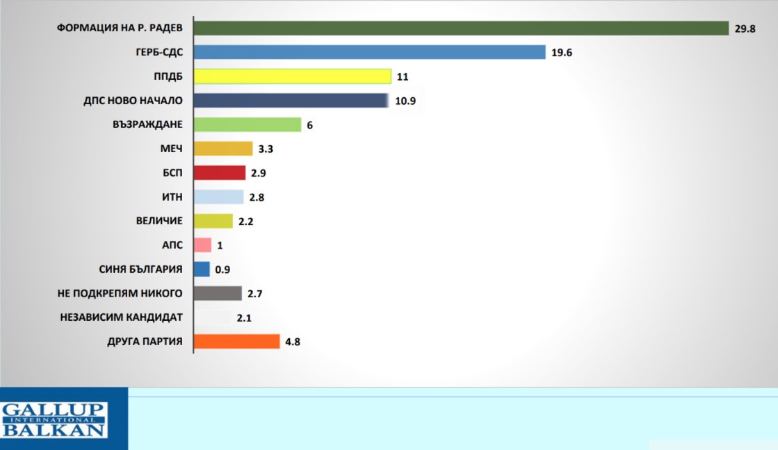 Новото изследване на „Галъп интернешънъл болкан“ разкрива актуални данни за електоралните нагласи на българските избиратели пред предстоящите извънредни парламентарни избори на 19 април 2026 г. Според социологическата агенция формацията около Румен Радев води с подкрепа от близо 30% и изпреварва значително ГЕРБ-СДС, които събират 19,6% от гласовете.