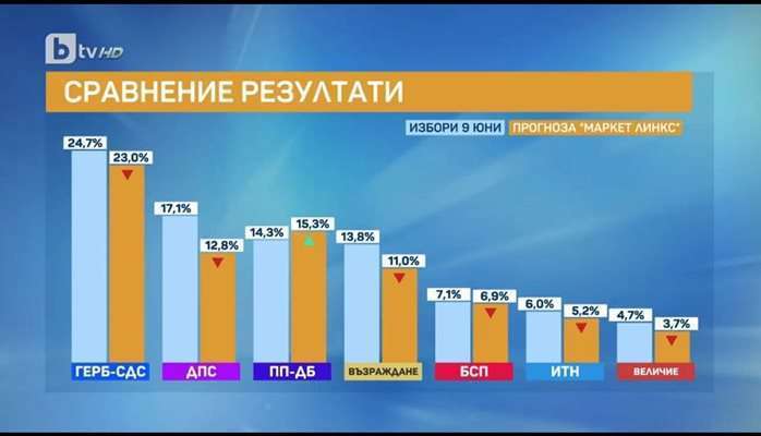 Ако изборите за Народно събрание се проведат днес ГЕРБ-СДС ще получи със 7,7% повече от втората политическа сила ПП-ДБ. Това показват резултатите от проучване на „Маркет ЛИНКС“, представени пред Би Ти Ви от социолога Добромир Живков от „Маркет Линкс“.