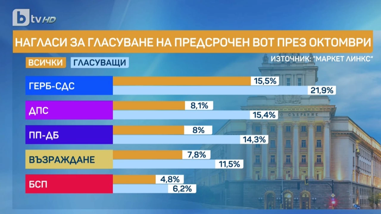 „Маркет линкс“: ГЕРБ е първа при вот сега, монолитно ДПС би било второ в НС