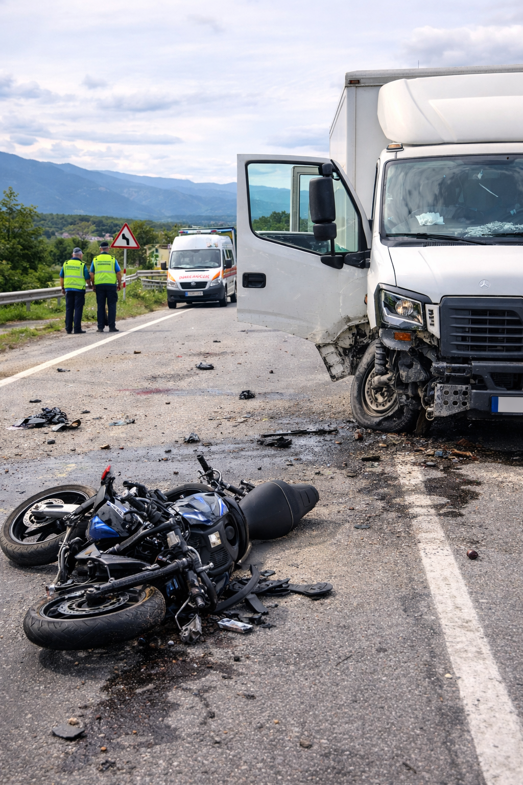 Инцидентът е станал днес около 12:13 часа в района на село Катунци. По първоначална информация мотоциклетистът е навлязъл в лентата за насрещно движение, където се е сблъскал с преминаващ товарен камион.