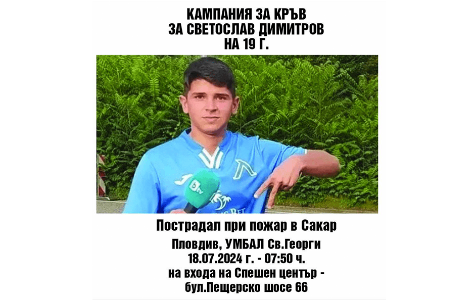 Съобщение за даряване на кръв, необходима за лечението на тежко пострадалия при големия пожар в Сакар 19-годишен Светослав Димитров, изпрати до сайта ни свиленградчанката Красимира Никова, която е финансист и живее в Пловдив. Тя лично е разговаряла с началника на Клиниката по изгаряния към УМБАЛ „Св. Георги“ в Пловдив доц. д-р Елеан Зънзов, който заявил, че това, от което имат нужда, е кръв за преливане, тъй като предстоели още операции на намиращия се в критично състояние пациент.