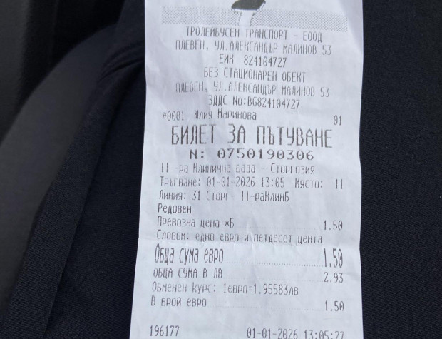 Инспектор на НАП е закупил билет с плащане в брой на борда на превозно средство на стойност 1,56 лв. (0,80 евро). За сравнение, на 30 декември 2025 г. същият билет е струвал 1,50 лв. (0,77 евро), което представлява увеличение с около 4%, без да има икономически обосновка.