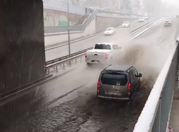 Валежите от дъжд, които вчера преминаха в сняг, са се събрали в най-ниската част на пробива. В резултат едната лента на западното платно е напълно под вода, което принуждава повечето шофьори да използват лявата лента. Водачите, които преминават през дясната, са принудени рязко да намаляват скоростта.