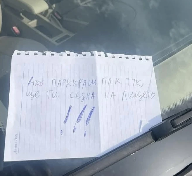 Жителите на район „Южен“ отдавна се оплакват от презастрояването и липсата на паркоместа. В резултат на това конфликтите за места зачестяват, а подобни „творчески“ бележки явно са част от ежедневието.