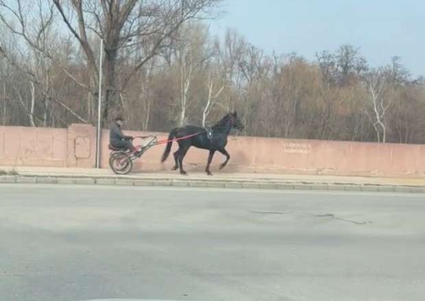 Шофьор на автомобил засне любопитна сцена на бул. „Марица“ – Север в посока кв. „Столипиново“: не велосипед или електрическа тротинетка, а мъж, управляващ двуколка с обязден кон, който спокойно се движи по велоалеята.