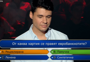 Пред седналия на Стола на богатството Иван Шопов беше поставен въпросът от какво е направено еврото – рециклирана хартия, памучна, ленена или синтетична.