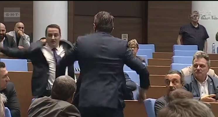 Повод за това стана напрежение между Ганев и депутата от ПП-ДБ Явор Божанков. При разгорещен спор, Ганев рязко се насочи към Божанков и го изблъска, докато той се движеше по една от пътеките в залата. Реакцията на председателката на Народното събрание Наталия Киселова беше незабавна: