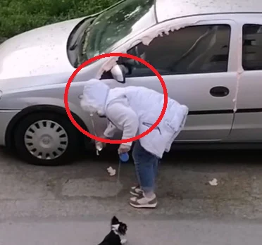 За да не бъде разпозната, тя е сложила качулка на главата си. След като запечатва с пяната вратите на колата, тя се навежда и напълва и ауспуха на автомобила.