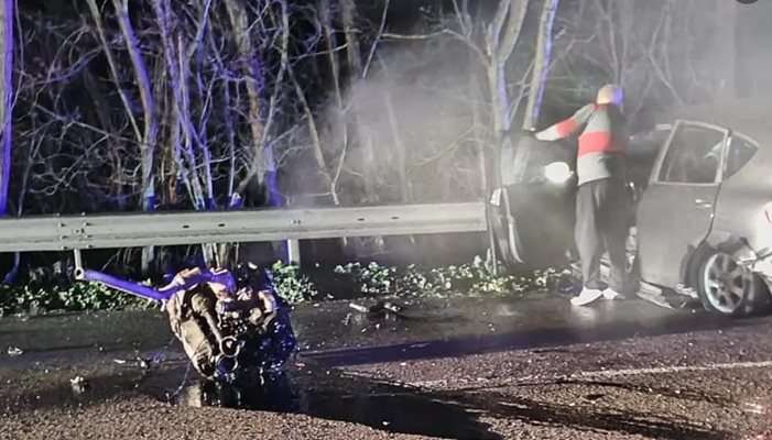 От снимката в социалната мрежа се вижда, че двигателят на един от автомобилите е изхвърчал на пътя.