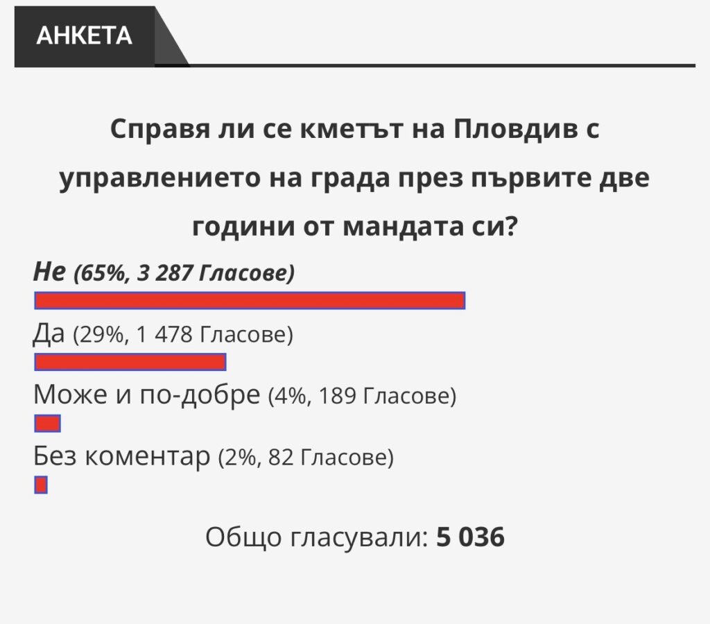 Резултатите от анкетата на NewsPoint са повече от красноречиви – 65% от гласувалите пловдивчани смятат, че кметът не се справя с управлението на града. Това не е просто статистика, а диагноза за състоянието на общественото доверие към местната власт две години след началото на мандата.