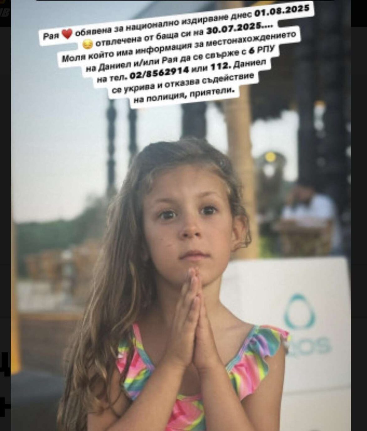 Полиция и близки издирват спешно малко момиченце на име Рая, което е обявено за национално издирване. Според публикации в социалните мрежи, детето е отвлечено от баща си Даниел на 30 юли 2025 г., а сигналът за издирване е подаден на 1 август.