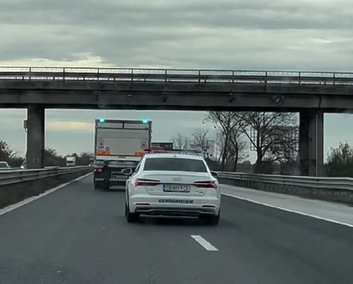 Анонимен потребител в социалните мрежи сподели видео, на което се вижда как две коли на жандармерията ескортират камион, преминавайки между лявата и дясната лента на магистрала „Тракия“.