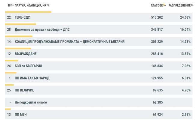 Следва ДПС с 16.54%. От „Продължаваме промяната – Демократична България“ остават трети с 14.58%, а „Възраждане“ е след тях с 13.87%.