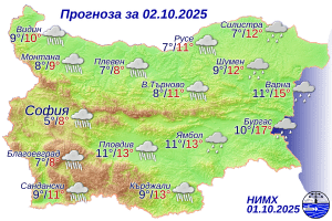 През следващото денонощие синоптичната обстановка в България ще бъде усложнена. Ще бъде облачно, ветровито и с валежи от дъжд. Значителни ще са валежите в Западна и в Централна България. Ще духа умерен, в Източна България – силен вятър от североизток. Температурите ще са без съществен дневен ход, минималните ще са между 6° и 11°, а максималните ще са между 8° и 13°. В София минималната температура ще е около 5°, максимална – около 8°. През нощта срещу петък с продължаващото понижение на температурите по високите западни полета и в Западния Предбалкан дъждът ще се примесва и преминава в мокър сняг.