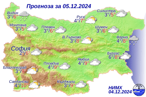 През започналото денонощие ще преобладава облачно, на места в равнините и мъгливо време. На отделни места в източните, а по-късно през деня и в западните райони ще превали слаб дъжд. Ще духа слаб, в Източна България до умерен вятър от изток-североизток. Минималните температури ще бъдат между 1° и 6°, а максималните – между 5° и 10°. В София минималната температура ще бъде около 2°, а максималната – около 6°, в  Пловдив минималната температура ще бъде около 4°, а максималната 9°.