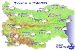 През нощта над по-голямата част от страната облачността временно ще намалее, по-значителна ще се задържи над източните райони. Западният вятър временно ще отслабне. Минималните температури ще са между минус 2° и 3°, в София – около минус 1°, в Пловдив – около 3°. През деня облачността бързо ще се увеличи и в следобедните часове ще е значителна. Ще започнат валежи, предимно от дъжд. Ще е ветровито, с умерен, в Дунавската равнина и западната част на Горнотракийската низина до силен запад-северозападен вятър. По-късно вечерта в Източна България вятърът ще се ориентира от север-североизток и с него ще нахлува студен въздух. В Североизточна България дъждът ще преминава в сняг и там ще се образува тънка снежна покривка. Максималните температури ще са между 9° и 14°, в София – около 10°, Пловдив – около 14°.