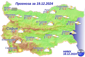 През нощта над страната ще има разкъсана висока облачност. В повечето места вятърът ще отслабне и ще стихне. След полунощ на места в низините и в котловините ще се образува мъгла или ниска облачност. Минималните температури ще бъдат между минус 2° и 3°, в София – около минус 1°, в Пловдив – около 2°. Преди обяд на места в низините и котловините ще бъде мъгливо. Около видимостта временно ще се подобри и след обяд над цялата страна ще преобладава слънчево време. Ще бъде почти тихо. Максималните температури ще са между 9° и 14°, в районите с по-трайни мъгли – между 4° и 8°, в София – около 8°, в Пловдив – около 12°.