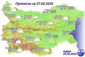 През нощта облачността над страната ще е разкъсана. На много места в низините и котловините ще има мъгла или ниска слоеста облачност. Минималните температури ще са в широки граници, от минус 6° – минус 8° в местата с мъгла, до около 5° в крайните югозападните райони. В София минималната температура ще е около минус 1°, в Пловдив минималната температура ще е около 2°. През деня над по-голямата част от страната облачността ще е значителна, по поречието на Дунав и на места в Източна България ще остане и мъгливо. Ще духа слаб, в източните райони – до умерен вятър от юг-югоизток. Максималните температури ще са между 6° и 11°, по-ниски в местата с трайна мъгла, в София – около 8°, в Пловдив – около 11°.