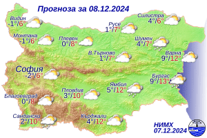 Днес валежите ще спрат, най-късно в източните райони. Над Западна България ще преобладава слънчево време, докато над останалата облачността ще е значителна. След обяд от запад-югозапад облачността отново ще се увеличи и до вечерта в крайните югозападни райони ще завали дъжд. Ще духа слаб до умерен вятър от изток-североизток, в Източна България от изток-югоизток. Максималните температури ще са между 6° и 11°, в източните райони до 14°, в София – около 6°, в Пловдив – около 10°.