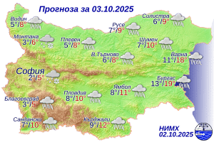 През следващото денонощие съществена промяна на времето няма да настъпи – облачно, с повсеместни и на много места значителни по количество валежи от дъжд, в планинските райони над 600-800 метра надморска височина – от сняг, а в Предбалкана и високите полета на Западна България временно около и след полунощ – от мокър сняг. В края на петъчния ден валежите в югозападните райони ще започнат да спират. Вятърът в източната половина от страната ще се задържи умерен и силен, а в западните райони ще се ориентира от запад-северозапад и ще бъде до умерен. Температурите ще са с малък денонощен ход: минималните в повечето места – между 4° и 9°, по високите полета на Западна България и Предбалкана – с 2°-3° по-ниски, за София – около 2°, за Пловдив – около 8°, максималните – между 6° и 11°, по черноморското крайбрежие – малко по-високи, за София – около 5°, за Пловдив – около 10°.
