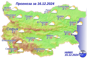 През нощта ще бъде предимно ясно, ще духа до умерен вятър от запад-северозапад. Утре ще бъде ветровито. Ще духа умерен, в Дунавската равнина – временно силен вятър от запад-северозапад. Ще преобладава слънчево време с по-значителни увеличения на облачността в следобедните часове над Северна България. Минималните температури ще бъдат между минус 1° и 4°, в София – около 1°, в Пловдив – около 2°. Максималните ще са между 6° и 11°, в София – около 7°, в Пловдив – около 9°.