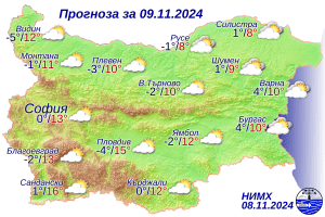 През нощта от североизток облачността ще се увеличава, но над по-голямата част от страната ще остане предимно ясно. В сутрешните часове на отделни места около водните басейни временно видимостта ще е намалена. Ще духа слаб, в Източна България до умерен вятър от изток-североизток. Минималните температури ще бъдат между минус 5° и 0°, по-високи по Черноморието, в София – около 0°. Утре облачността ще продължи да се увеличава и до края на деня ще е значителна. Привечер в крайните североизточни райони ще завали дъжд. Вятърът ще се ориентира от север-североизток и ще е умерен, с него ще започне да нахлува студен въздух. Дневните температури ще се понижават и към 14 ч ще са от 8°-9° в североизточните до 15°-16° в югозападните райони, в София – около 13°, в Пловдив – около 15°.