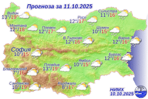 Днес северозападният вятър ще се усили и ще бъде умерен и силен. Преди обяд облачността ще бъде значителна и на места в източната половина от страната и планинските райони ще има валежи. Към обяд облачността от север ще започне да се разкъсва и да намалява и до вечерта над цялата страна ще се установи слънчево време. Дневните температури слабо ще се понижат и максималните ще бъдат между 14° и 19°, в София – около 15°, в Пловдив – около 19°.