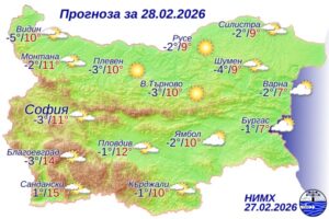 През нощта над по-голямата част от страната ще бъде предимно ясно и почти тихо. По-значителна ниска облачност ще има над Източна България, където ще духа до умерен вятър от север-североизток. В сутрешните часове на отделни места в котловините и поречията ще има намалена видимост. Минималните температури ще бъдат между минус 5° и 0°, за София – около минус 3°. Утре ще бъде предимно слънчево. Все още сутринта над източните райони ще има значителна облачност, която до обяд ще намалее и там ще се установява предимно слънчево време. Ще духа слаб до умерен вятър от изток-североизток. Максималните температури ще бъдат между 8° и 13°, в Югозападна България – до 15°, за София – около 11°, за Пловдив – около 12°.