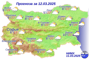 Над планините облачността ще бъде значителна. Преди обяд на отделни места в Източните Родопи, Странджа и Сакар ще има превалявания от дъжд. Ще продължи да духа силен, по високите части – до бурен вятър от югозапад. Максималната температура на височина 1200 метра ще бъде около 15°, на 2000 метра – около 9°.