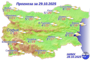 През нощта ще е предимно ясно. Вятърът ще отслабне и в много райони ще стихне, сутринта на места в равнинната част от страната ще има мъгла или ниска слоеста облачност. Минималните температури ще бъдат между 1° и 6°, в София – около 1°, в Пловдив – около 4°. Утре ще е предимно слънчево. Ще духа слаб до умерен югозападен вятър. Дневните температури ще се повишат и максималните ще бъдат между 16° и 21°, в София – около 16°, в Пловдив – около 19°.