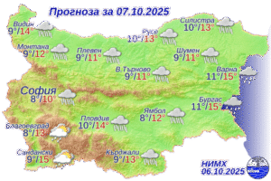 През следващото денонощие ще се задържи облачно. Продължителни и значителни валежи от дъжд ще има в източните и северните райони от страната. Утре в югозападните и централните южни части от страната валежите ще отслабнат, но с прекъсване все още на места ще превалява дъжд. Ще духа умерен и временно силен вятър от запад-северозапад, а в североизточните райони – от север-североизток. Минималните температури ще бъдат между 6° и 11°, за София – около 8°, за Пловдив – около 10°, максималните – между 10° и 15°, за София – около 10°, за Пловдив – около 14°.