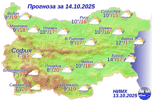 През следващото денонощие облачността над страната ще се задържи предимно значителна, със слаби превалявания през деня на отделни места в източните и планинските райони. По-съществени разкъсвания и намаления на облачността ще има преди обяд над Югозападна България. През нощта вятърът ще е слаб от запад-югозапад, а утре – слаб до умерен от северозапад. Минималните температури ще бъдат между 5° и 10°, а максималните – между 15° и 20°. В София минималната температура ще бъде около 7°, максималната – около 15°,в Пловдив минималната температура ще бъде около 8°, максималната – около 20°.
