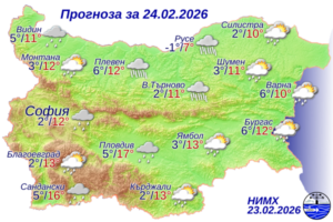 Днес през страната ще премине студен фронт. Ще бъде предимно облачно. От северозапад на югоизток на много места ще превали дъжд. На места в северните и планинските райони валежите ще са временно интензивни и повече по количество. Вятърът ще бъде от запад-северозапад, след обяд ще се усили и ще е умерен, в Дунавската равнина, западната част на Горнотракийската низина и долините на Струма и Места – до силен. Преобладаващите максимални температури ще бъдат 10°-15°, в София – около 12°, в Пловдив – около 17°.