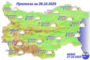 През нощта започналото от северозапад увеличение на облачността ще обхване по-голямата част от страната и на места в Северозападна България ще превали дъжд. На места в Горнотракийската низана ще е мъгливо. Вятърът за кратко ще се ориентира от запад-югозапад, ще е слаб. Минималните температури ще бъдат между 3° и 8°, в София – около 4°, в Пловдив – около 6°. Преди обяд облачността ще е значителна и на места от северозапад на югоизток ще превали дъжд. На повече места и повече по количество ще са валежите в Югозападна България, а почти без валежи ще се задържи в североизточните райони. След обяд от северозапад облачността ще се разкъсва и ще намалява. Ще духа умерен, в Дунавската равнина и Горнотракийската низина – силен вятър от запад-северозапад. Максималните температури ще бъдат между 11° и 16°, в София – около 11°, в Пловдив – около 15°.