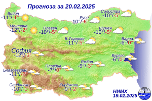 През втората половина на нощта ще е ясно и почти тихо. На места в Дунавската равнина ще се образува мъгла. Минималните температури ще бъдат предимно между минус 14° и минус 8°, на отделни места – до минус 18°-минус 17°, за София – около минус 12°, за Пловдив – около минус 7°. През деня ще бъде предимно слънчево. Преди обяд над Дунавската равнина ще има ниска слоеста облачност. Ще духа слаб вятър предимно от север-североизток. Най-високите дневни температури в повечето места ще бъдат между минус 5° и 0°, за София – около минус 3°, за Пловдив – около 0°.