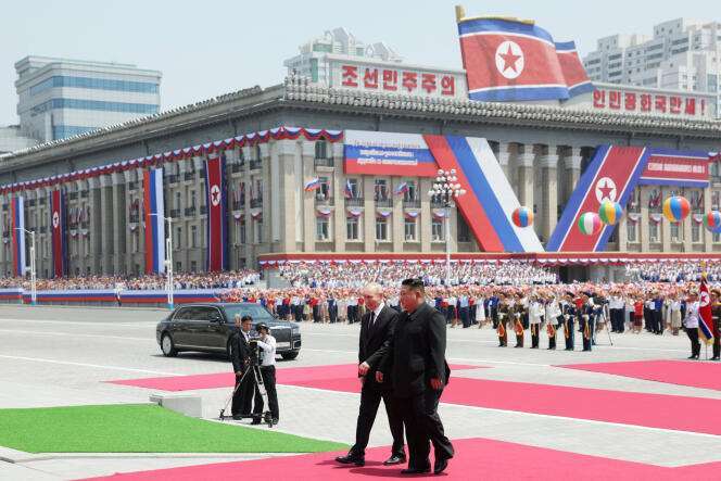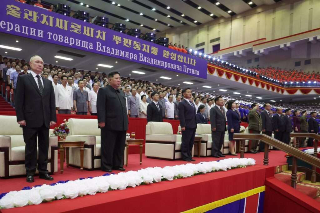 Президентът на Русия Владимир Путин и лидерът на Северна Корея Ким Чен Ун присъстват на официална церемония по посрещане на площад Ким Ир Сен в Пхенян, Северна Корея, 19 юни 2024 г. Sputnik/Гавриил Григоров/Pool чрез REUTERS НА ВНИМАНИЕТО НА РЕДАКТОРИТЕ – ТОВА ИЗОБРАЖЕНИЕ Е ПРЕДОСТАВЕН ОТ ТРЕТА СТРАНА .