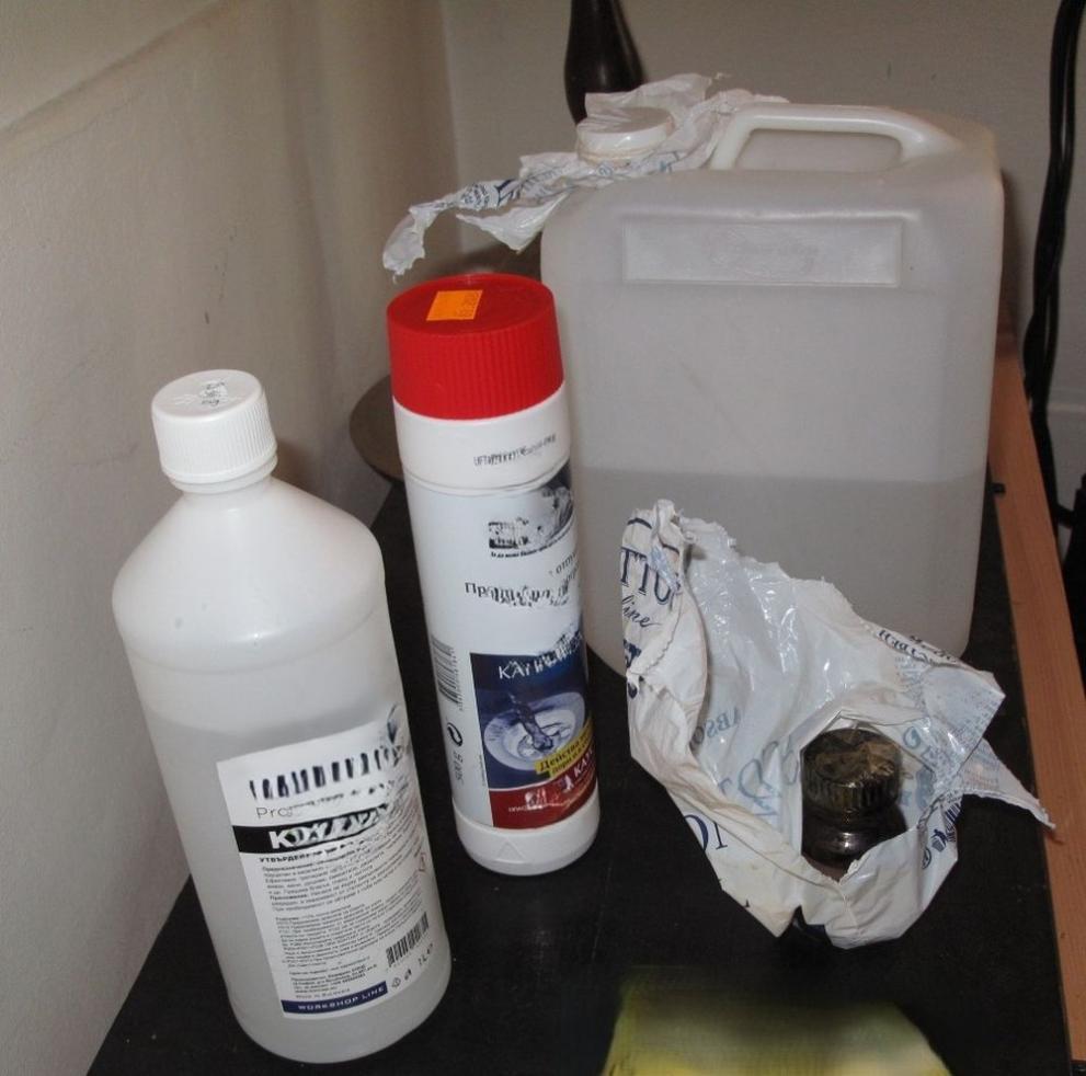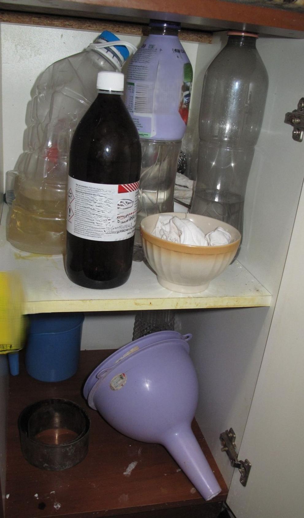 Разкрита е нарколабораторията. Сред иззетите доказателства са различни химически субстанции и препарати.