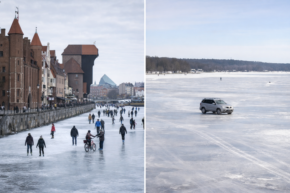 Река Мотлава, преминаваща през центъра на полския град Гданск, се е превърнала в естествена ледена пързалка. Вече повече от седмица дневните температури се задържат около –8 градуса, а през нощта падат под –15. В резултат реката е замръзнала толкова плътно, че хората започнаха да се разхождат по нея.