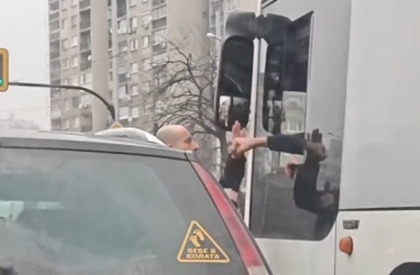 Във видеото се вижда как шофьор на автомобил е излязъл от колата си и се бие с шофьор на автобус, който обаче е в превозното средство. Причините за спора им не са ясни, пише 24часа.