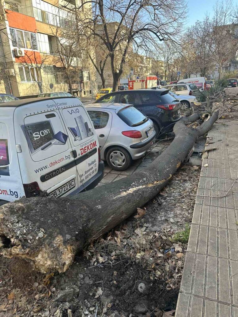 Силният вятър, който вилнее в Пловдив и региона, е причинил сериозни щети по автомобили и градска инфраструктура. От Регионалната дирекция „Пожарна безопасност и защита на населението“ съобщават, че всички дежурни екипи са били мобилизирани заради множество сигнали за паднали дървета и сухи клони.