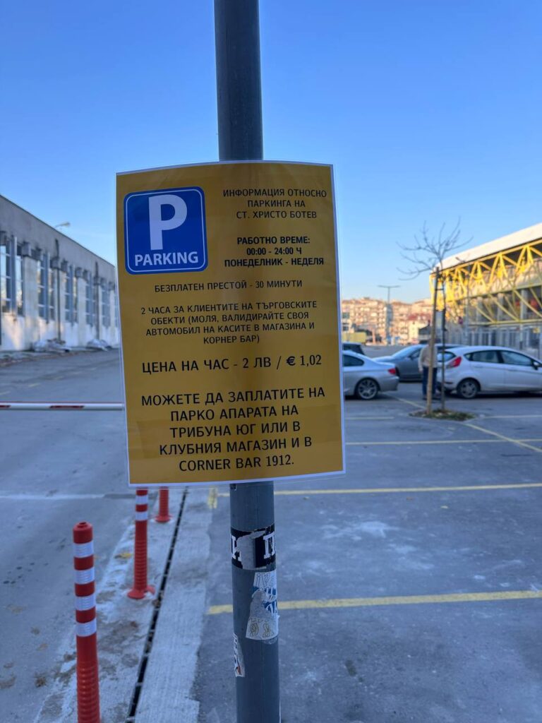 Паркингът, който обслужва залите по бокс, кикбокс, карате, борба, художествена гимнастика и таекуондо – място, където всеки ден родители водят децата си на тренировки, изведнъж се оказа… платен. С табелка „къде се плаща“ – в клубния магазин на „Ботев“ Пловдив, Corner Bar, плюс поставен паркомат.