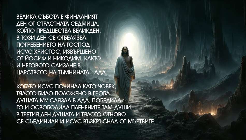 Велика събота е свързана с оплакването и погребението на Исус Христос от майка му Света Богородица и жените около нея. Гробът му е запечатан и пред него е поставена стража. След своята кръстна смърт Христос слиза в ада, освобождава библейските пророци и праведниците и ги отвежда в небесата. Така започва новата ера в историята на човечеството – правото на човека на свободен избор – да бъде добър или лош и след смъртта си да постигне рая или ада.