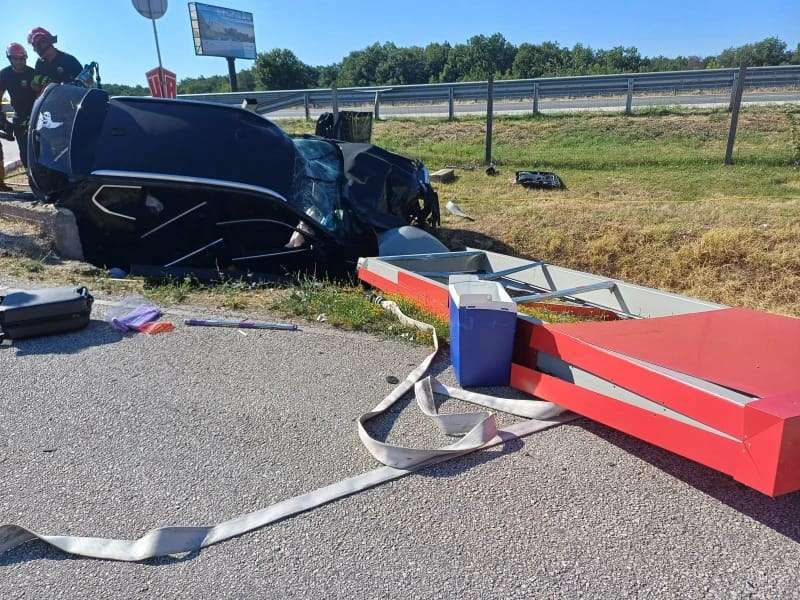Джип БМВ, в който са пътували двама възрастни и две деца (турски граждани), излиза вдясно извън пътното платно, удря се в реклама и преустановява движението си.